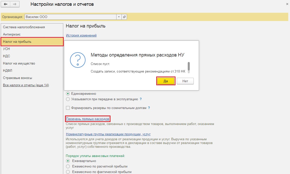 В открывшейся форме необходимо выбрать вкладку «Налог на прибыль», а затем перейти к «Перечню прямых расходов». Единого сводного списка для каждого предприятия в Налоговом кодексе не предусмотрено. При первичном выборе ссылки пользователю будет предложено заполнение раздела в соответствии с 318 статьей Налогового кодекса.