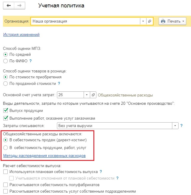 • перейти по ссылке «Методы распределения косвенных расходов»;