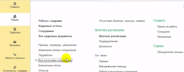 Для регистрации дня диспансеризации в программе 1С:Зарплата и управление персоналом 8, в третьей редакции, следует зайти в меню кадры, все отсутствия сотрудников