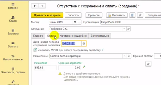 Для выбранного сотрудника указать вид отсутствия – диспансеризация