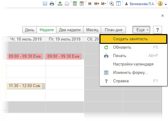 Также пользователь может указать временные отрезки, когда он занят или свободен. Для этого нужно сначала нажать на кнопку "Ещё", потом на "Создать занятость".