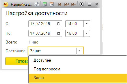 Для настройки доступности указываем дату, время и состояние пользователя - занят или свободен.