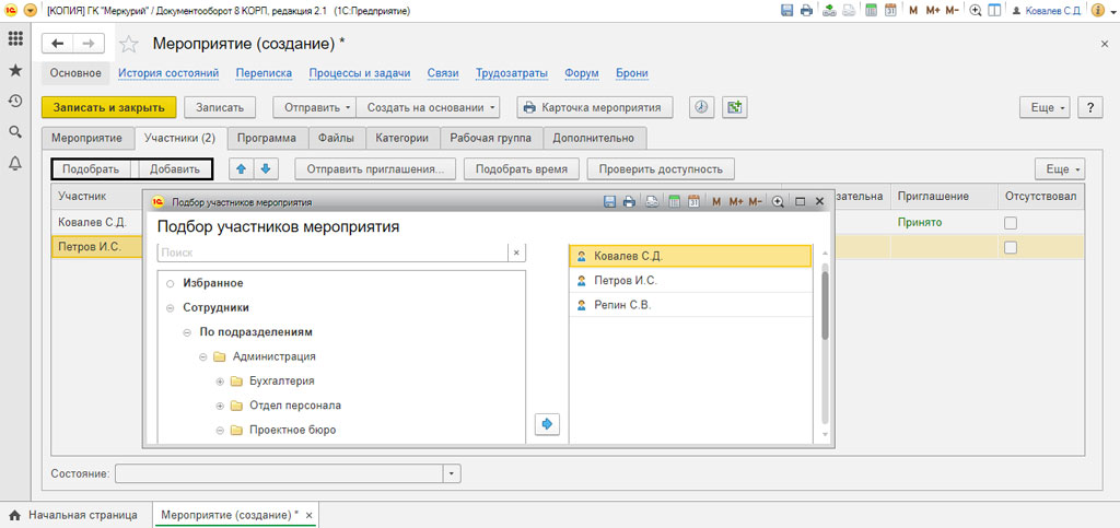 При создании мероприятия программа сможет подобрать наиболее удобное для всех сотрудников время.