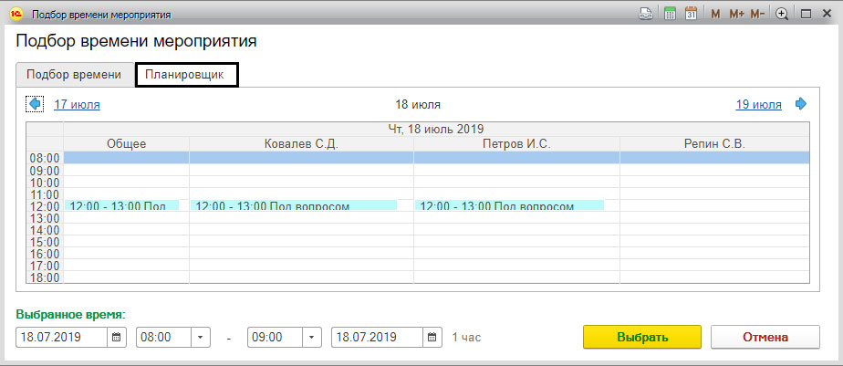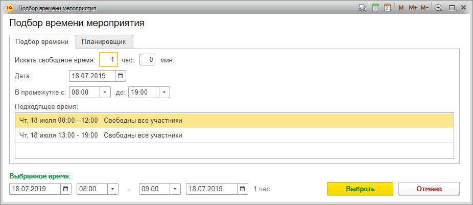 Также, указывается и свободное время сотрудников. При нажатии кнопки "Подобрать время", программа поможет выбрать наиболее подходящее.