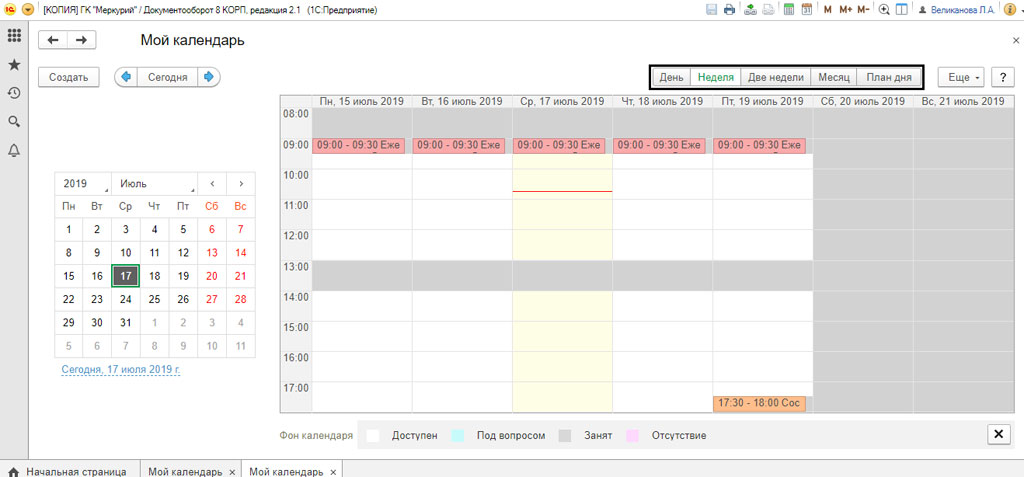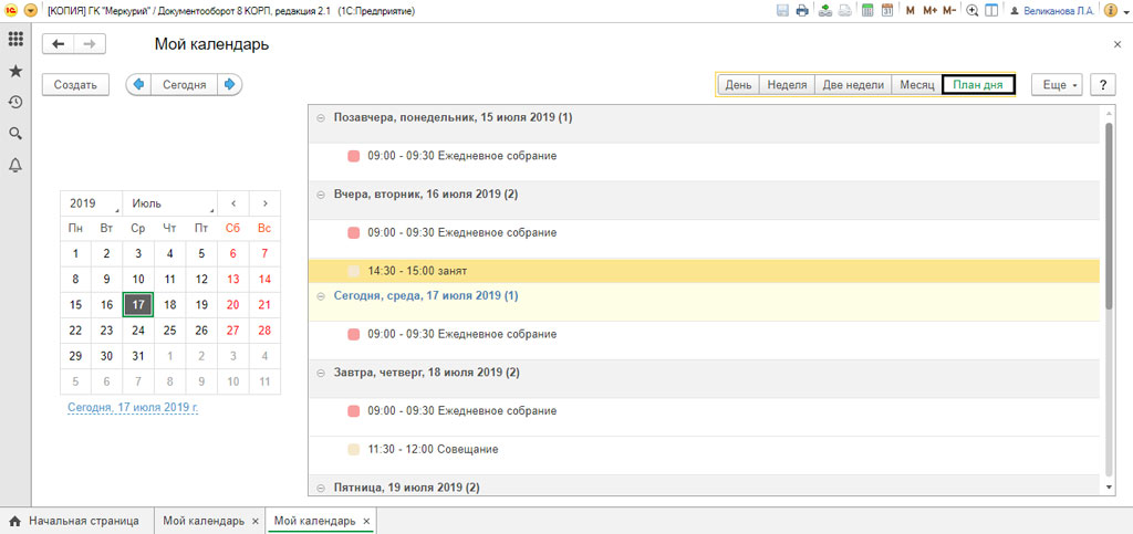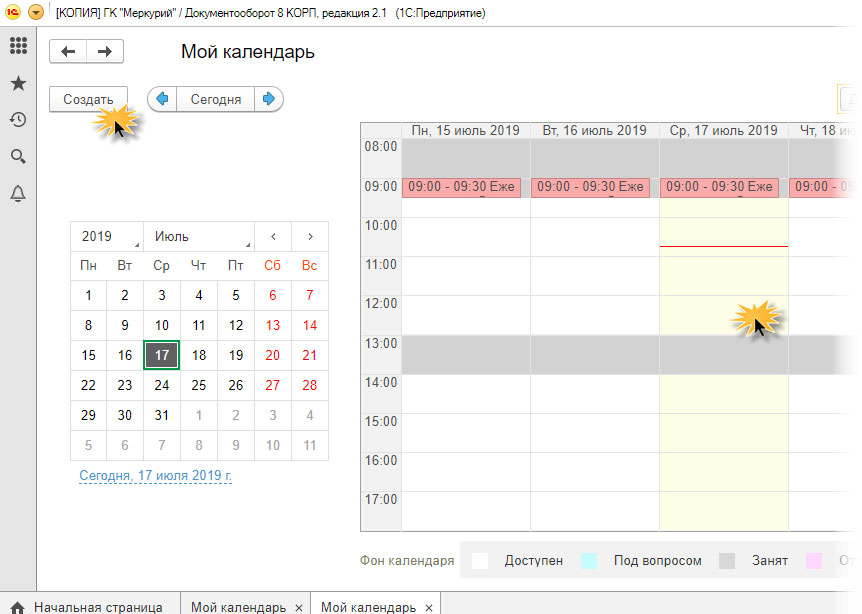 Для контроля времени пользователей в программе «1С:Документооборот» имеется функция календаря.