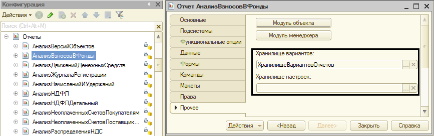 Когда мы открываем свойства любого отчета в режиме конфигурирования, то на вкладке «прочее» можем увидеть параметр, который определяет заданное хранилище для сохранения и восстановления установок конкретного отчета.