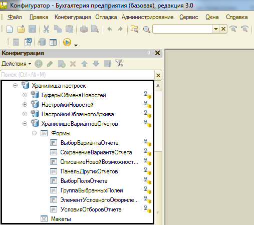 Как работает «Хранилище настроек»? Оно является объектом метаданных, который пописывает порядок хранения установленных настроек у некоторых объектов. Так, для примера мы откроем программу, «1C: Бухгалтерия», перейдем в конфигурационный режим и развернем дерево данных. Нам понадобится узел, который находится по следующему пути: