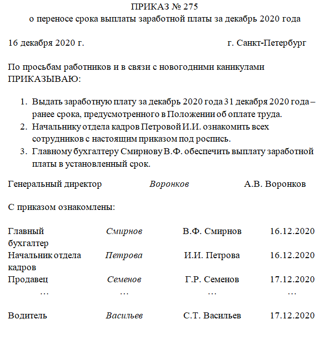 Однако нужно учесть, что временной период между выплатами должен быть 15 дней, а в этой ситуации в январе будет нарушение ст. 136 ТК РФ. Но Роструд уверяет, что штрафовать за это не будет. Чтобы не было разногласий и претензий, можно издать приказ о досрочной выдаче декабрьской зарплаты. В нем желательно указать, что оплата труда за декабрь выдается в полном объеме или частично.