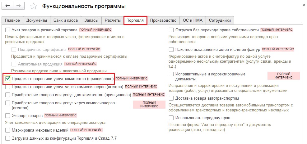Сначала проверяются настройки программы 1С. Для этого нужно последовательно перейти в разделы «Администрирование» и «Функциональность». В дополнительном разделе «Функциональность» выполняется переход на вкладку «Торговля» и проверяется наличие чекбокса напротив надписи «Продажа товаров и услуг комитентов».