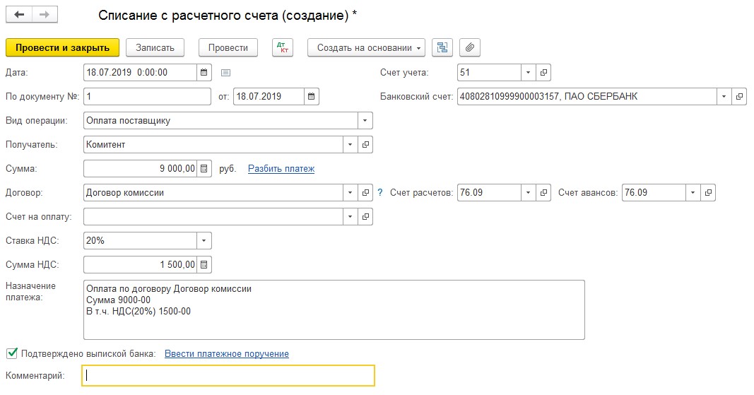 Завершающий этап – перевод денежных средств комитенту после удержания из них комиссионного вознаграждения. Данная операция запускается с помощью команды «Ввод на основании» в отчете комитента или в разделе «Списание». Переходить в него следует по пути: «Банк и касса» - «Банковские выписки».