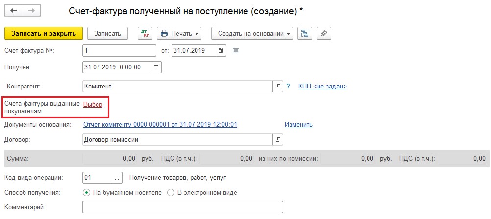 Документ формирует проводку Дт 76.09 Кт 51 на разницу между заработком комиссионера и суммой реализации. Далее потребуется регистрация счета-фактуры комитента. Лучше вводить ее, основываясь на документе «Отчет комитенту» - Счет-фактура на поступление». Нужно заполнить номер счета и дату, а затем активировать клавишу «Выбор».