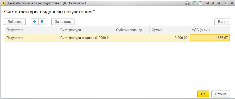 В отдельном окне «Счета-фактуры, выданные покупателям», нужно добавить счет, сформированный при реализации товаров. Операция выполняется клавишей «Заполнить».