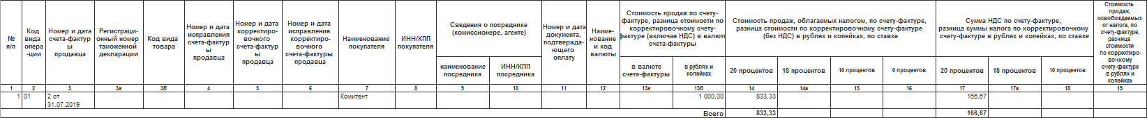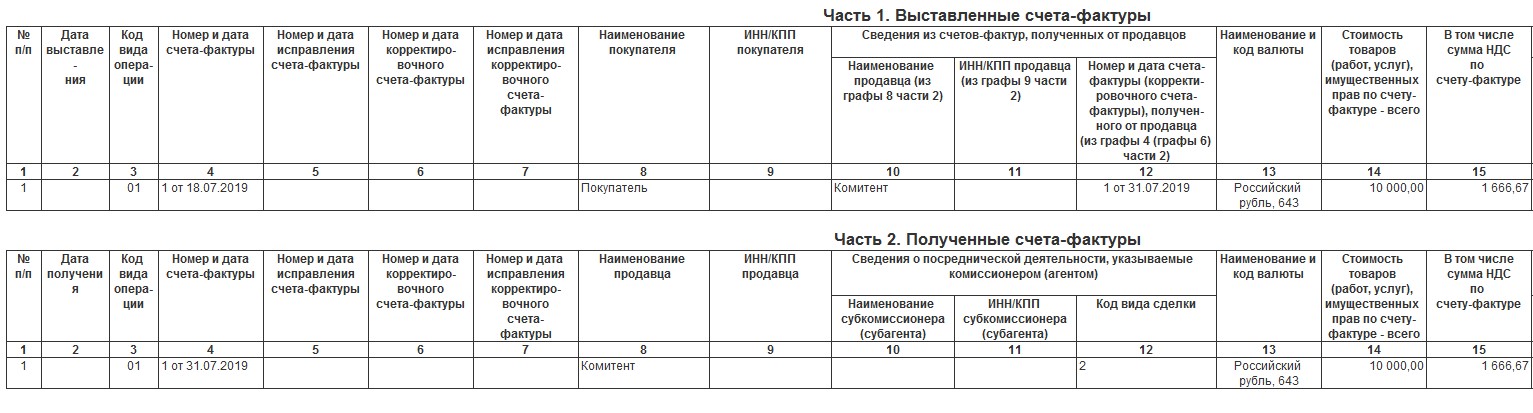 В книге продаж появляется счет-фактура, зарегистрированный в отчете комитенту на размер комиссионного вознаграждения. В книге покупок информация об этих операциях не появится.