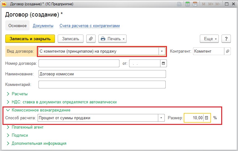 Ключевые реквизиты, влияющие на правильность отражения операции, - вид формируемой номенклатуры и договор. В договоре обязательно указывается вид «С комитентом на продажу». Во вкладке «Комиссионное вознаграждение» выбирается способ расчета. В примере ниже рассматривается процесс заполнения договора с вознаграждением процентами от суммы продаж.