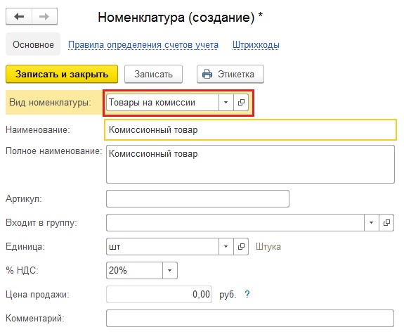 Во время формирования позиций номенклатуры рекомендуется контролировать их вид и выбирать «Товары на комиссии».