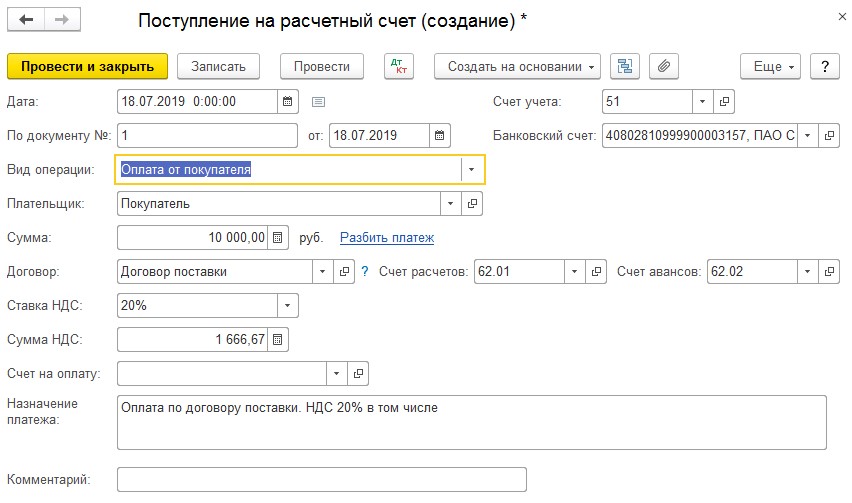Следующий шаг – отражение информации о полученных средствах от покупателя. Данные должны быть отражены в в подразделе «Поступление». Перейти в раздел можно по вкладкам «Банк и касса» - «Банковские выписки». Проведенный документ формирует проводки Дт 51 Кт 62.01.