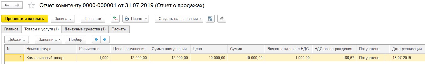 Далее стоит перейти к реализации комиссионных товаров в разделах «Продажи» - «Реализация» - заполнить документ необходимой информацией.