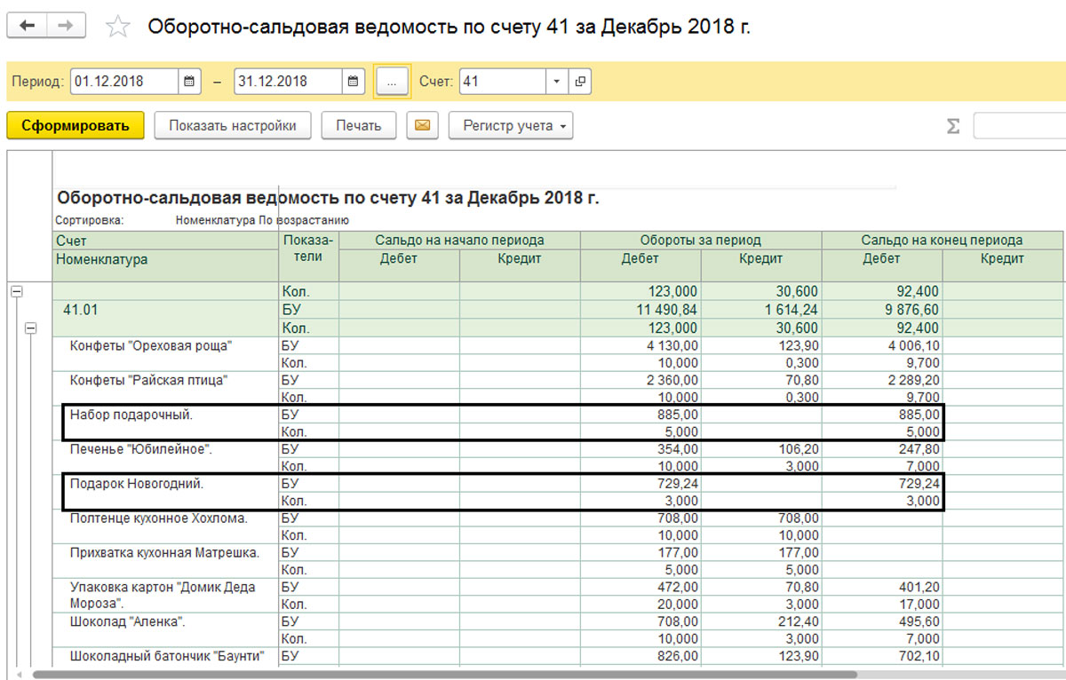 Займёмся "Оборотной-сальдовой ведомостью по счету 41 - Товары" (выбираем в меню "Отчеты-Стандартные-Оборотно-сальдовая ведомость по счету"). На остатках появятся созданные нами номенклатуры "Набор подарочный" и "Подарок новогодний".
