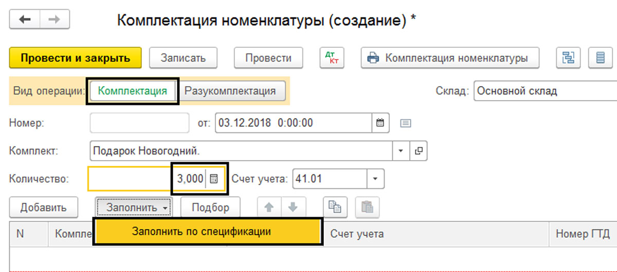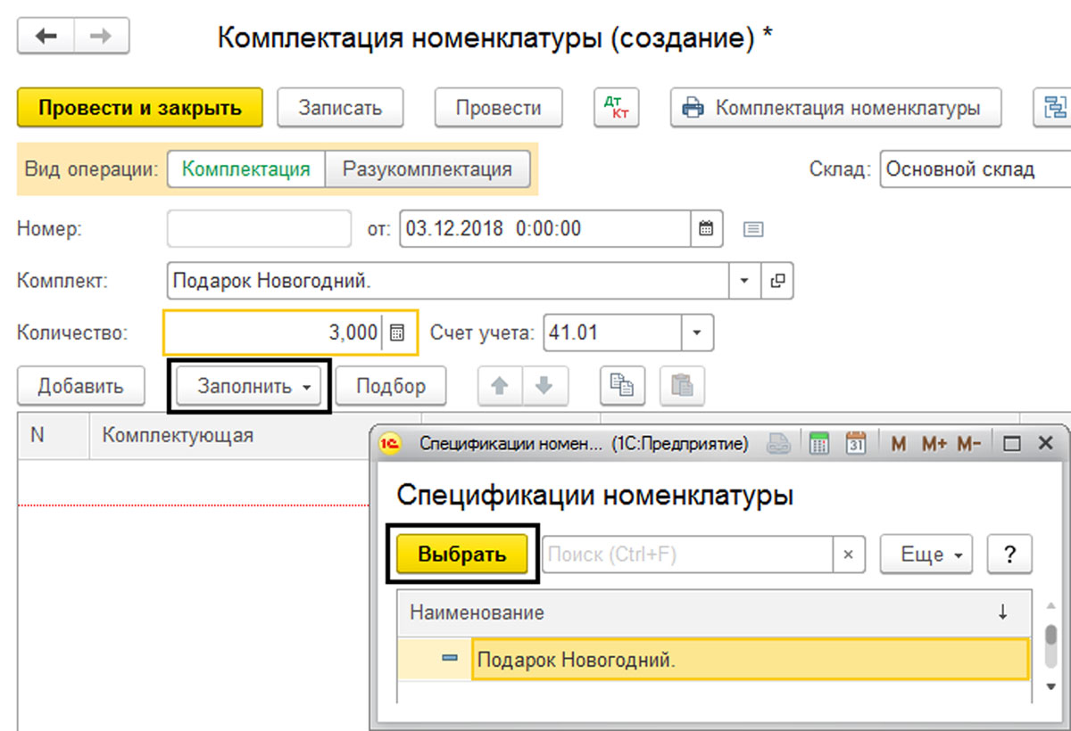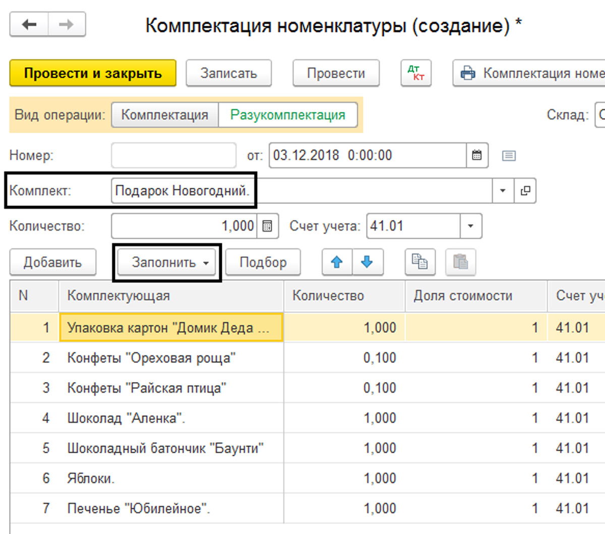 Заполняем документ "Комплектация" в соответствии с операцией "Декомплектация". К примеру, не все позиции "Подарка новогоднего" были реализованы, и теперь необходимо разобрать этот комплект по частям. После нажатия на кнопку "Заполнить" наблюдаем за заполнением таблицы в соответствии нашим нормативам.