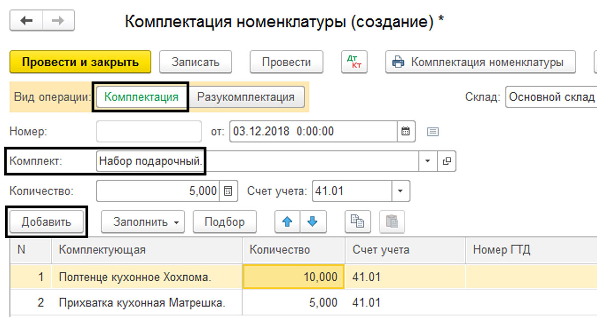По стандартным настройкам в документе установлена операция "Комплектация". Далее мы выбираем наименование сформированного комплекта и создаём Набор подарочный" - новую часть номенклатуры. В графу "Количество" вписываем цифру, соответствующую количеству комплектов. В таблице собираем все комплектующие и указываем номенклатурные позиции, подлежащие списанию.