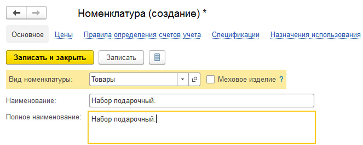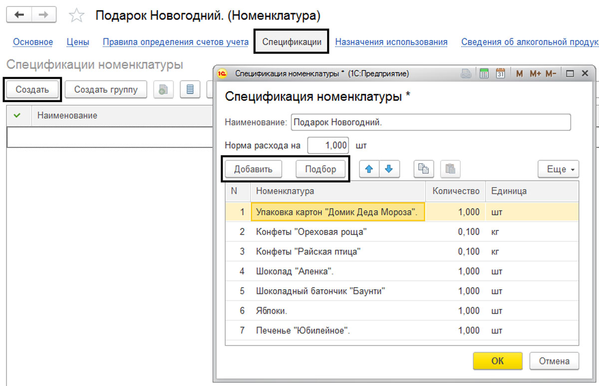 Заполнение спецификации требуется, если комплект имеет внушительные размеры. С этой целью в справочник "Номенклатура" включён раздел "Спецификация", в котором содержится информация о нормативном составе товара или комплекта. Создадим новую номенклатурную позицию и назовём её "Подарок Новогодний". Для этого переходим по гиперссылке "Спецификация" и щелкаем на кнопку "Создать". Далее указываем список включённых в набор товаров через кнопки "Добавить" или "Подбор".