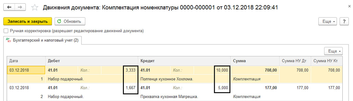 Не всегда с коэффициентом проще указать стоимость. Когда мы самостоятельно хотим назначить цену на позиции, можно прибегнуть к её ручной корректировке. Допустим, что стол из нашего мебельного набора будет стоить 8700 рублей, а каждый стул - 2090 рублей. Подсчитываем стоимость всех стульев и получаем 12540 рублей. В документе уже сформировано движение, открываем его и устанавливаем галочку напротив пункта "Ручная корректировка", после чего заносим изменения. Щелкаем на пункт «Записать и закрыть».