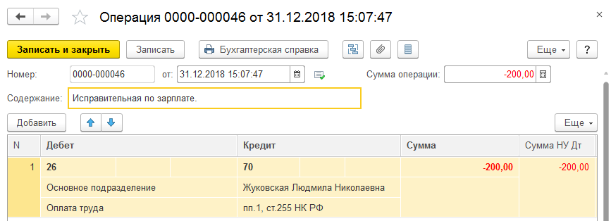 Пример. Пользователь не учел движение по регистрам при вводе данных «Операция, введенная вручную». Возникла необходимость исправить начисление заработной платы. Операция проводится в соответствующем документе по начислению заработной платы. На примере мы уменьшим сумму заработной платы.
