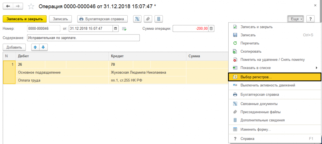 Возвратимся к работе с документом «Операция». С помощью вкладки «Еще» - активируем «Выбор регистров».