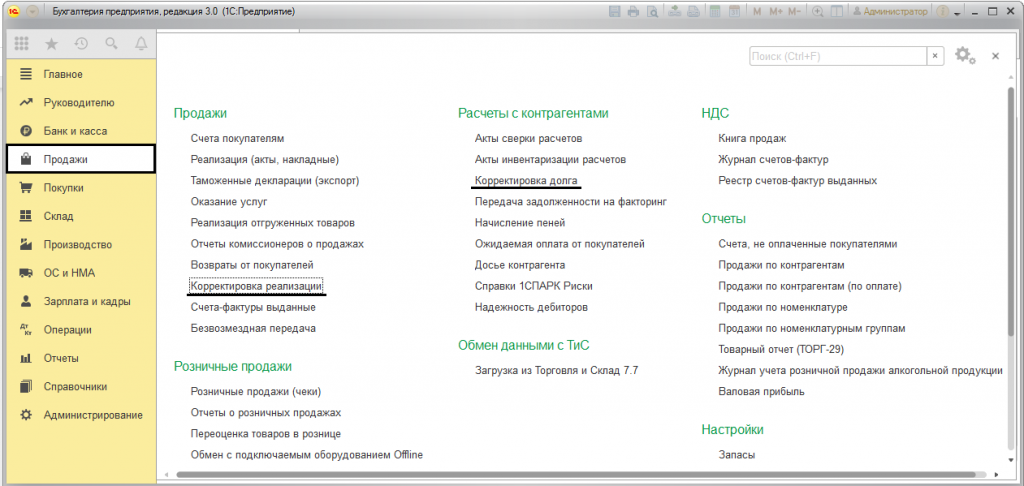 Данная операция рассматривается как пример. Некоторые программы поступают к пользователю уже с корректировочными документами. В программе 1С Бухгалтерия предусмотрены следующие корректировки: