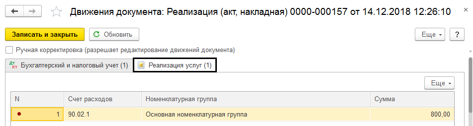 ... и «Реализации услуг». Из записей становится ясно, что помимо бухгалтерских операций, отчет о движении документа содержит разные закладки. Так выглядят записи регистров, для каждого документа они меняют свой вид.