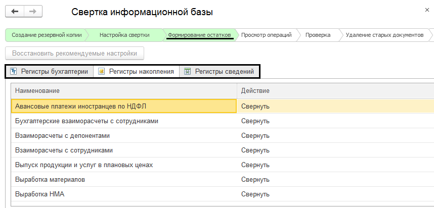 Регистры, сформированные обработкой «Свертка информационной базы»