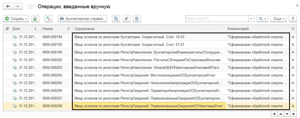 Пользователь может изменять или просто удалить полученный отчет. Он расположен в журнале «Операции, введенные вручную».