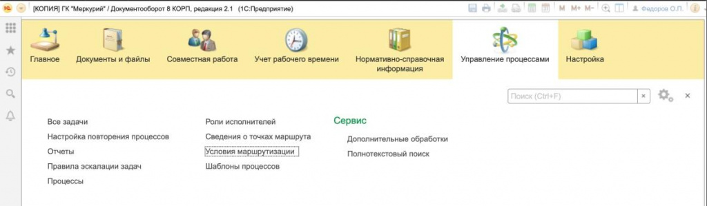 Для настройки параметров маршрутизации в программе 1С:Документооборот, нужно перейти во вкладку «Управление процессами», выбрать в появившемся меню строчку «Условия маршрутизации».