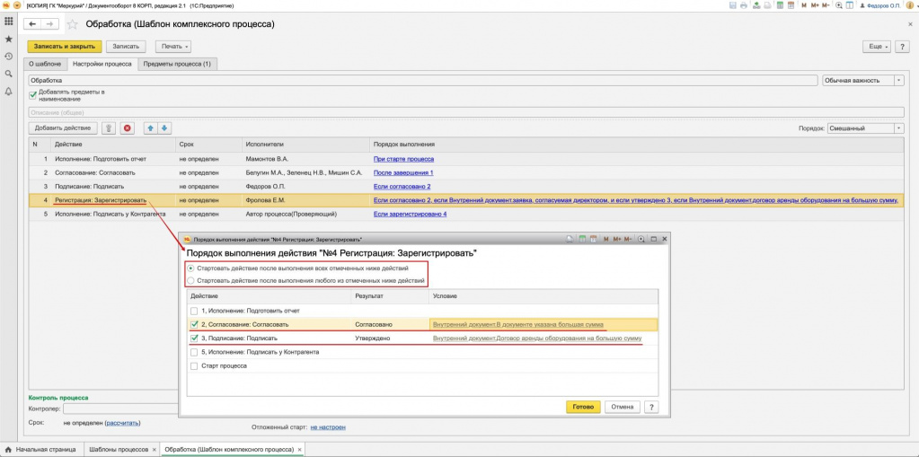 Используя различные условия внутри несложных процессов в ходе выполнения различных действий, задавая сложные условия маршрутизации различными способами (на встроенном языке, комбинированные варианты), можно сконструировать сложнейшие, многоуровневые бизнес-процессы для обработки и согласования документов, контрагентов и прочего.