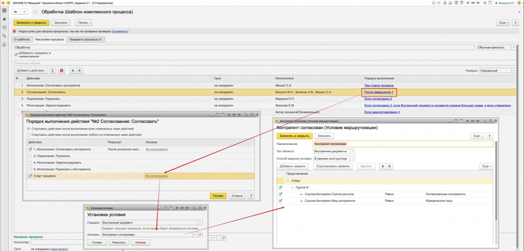 Например, в нашем примере с контрагентом обязательно нужно предусмотреть модель условия, где контрагент согласован, а начальный этап с согласованием из-за этого не запустится. Поэтому, чтобы процесс не выдал ошибку, то вторым этапом нужно включить в условие при старте – Контрагент согласован.