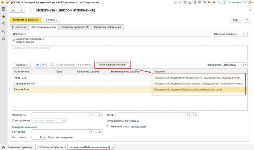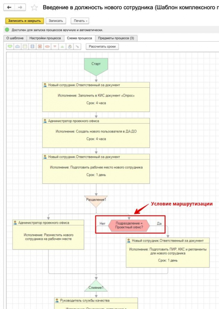 В том случае, если в процесс вовлечены более одного исполнителя, необходимо обязательно использовать условия маршрутизации, так как в случае невыполнении данного условия, программа выдаст ошибку, ведь исполнитель не указан. Подобные условия маршрутизации также могут быть использованы в комплексных бизнес-процессах.