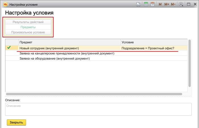 Настройка условий предусматривает использование различных результатов действий, произвольные данные или предметы. Например, в работе с настройкой процессов в таблице мы уже создавали условия на основе предмета. Как результат – получили процесс согласования контрагента. При необходимости, произвести действия с произвольными условиями можно, задав произвольные параметры.