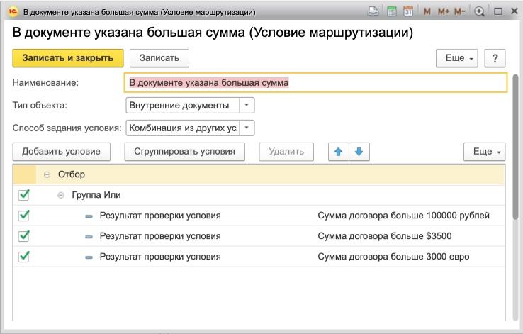 Как видно из примера, регистрация документа выполнится в том случае, если будет согласован документ с большой суммой, а также подписан договор аренды на большую сумму.