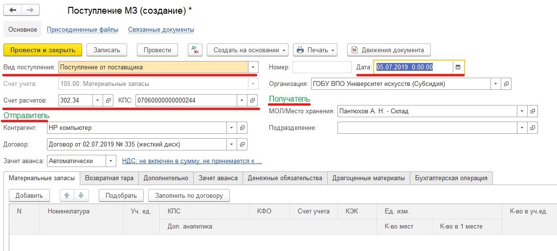 Указывается вид поступления. "Поступления от поставщика". В этой графе указывается дата приобретения, счет взаиморасчетов с КПС. В графе "Отправитель" указывается поставщик и номер договора, который заключили при покупке. В графе "Получатель" - материально ответственный центр.