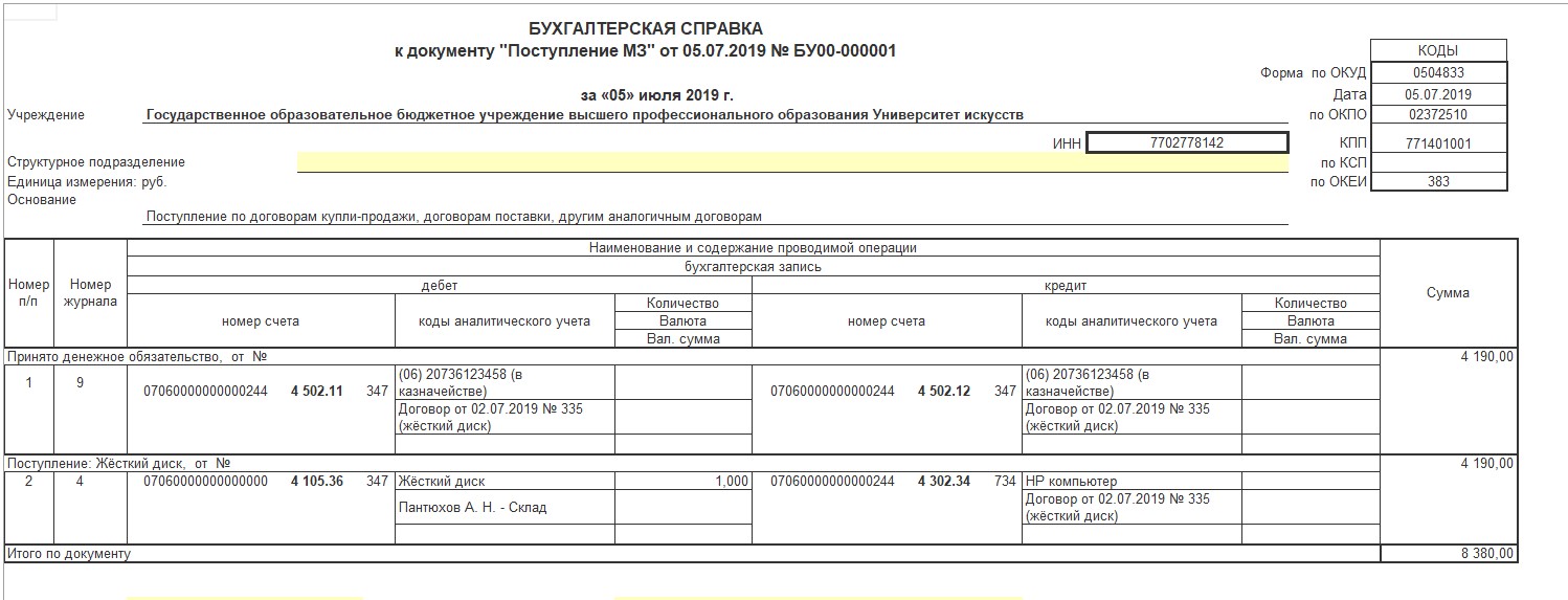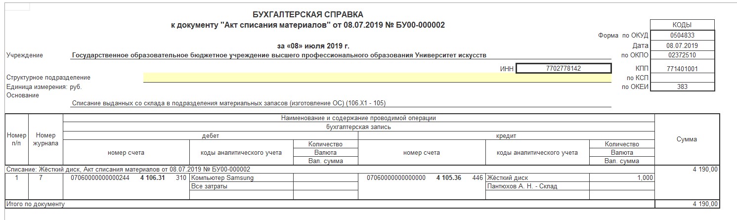 Документ проводится и на печать отправляется бухгалтерская справка.