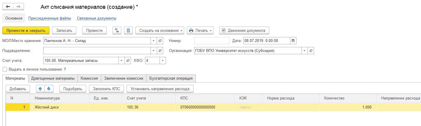 Следующие действия надо отобразить касательно покупки жесткого диска, отображаются они в графе "Поступление МЗ".