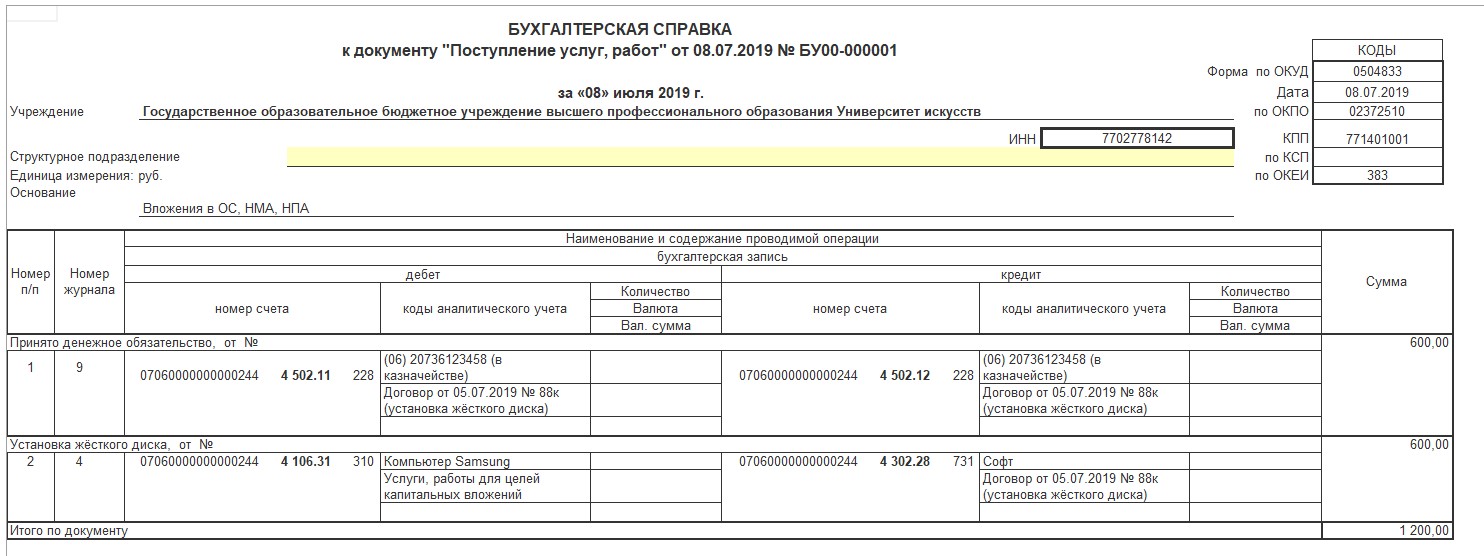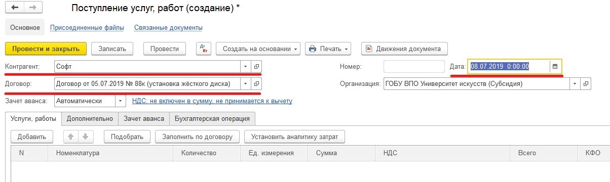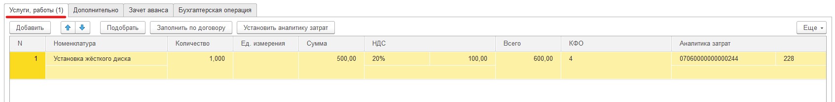 Так как услугу по установке жесткого диска производит поставщик, который не имеет отношения к поставщику, который продавал организации компьютер, нужно отобразить этот факт в разделе "Поступление услуг и работ".