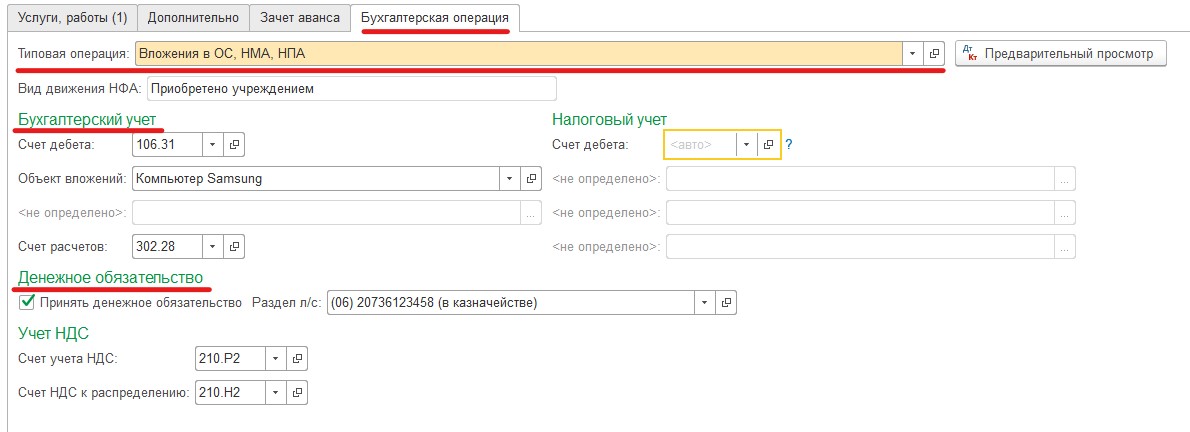 В разделе "Бухгалтерские операции" отображают операцию "Вложение в основные средства". Указывается лицевой счет для выполнения финансовый операций.