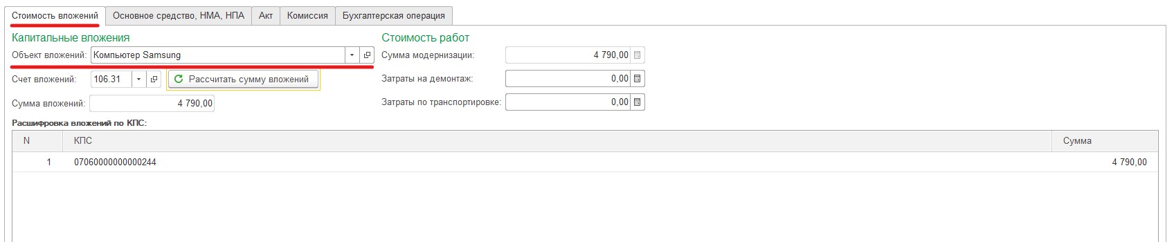 Если все вышеуказанные действия выполнены правильно, то в документе отражается сумма вложенная в модернизацию, также цена основного средства до модернизации и после модернизации. Все эти суммы отображены в разделе "Стоимость вложений"