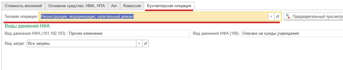Выбирается вид операции "Модернизация и реконструкция основных средств" и указывается КФО и КПС.