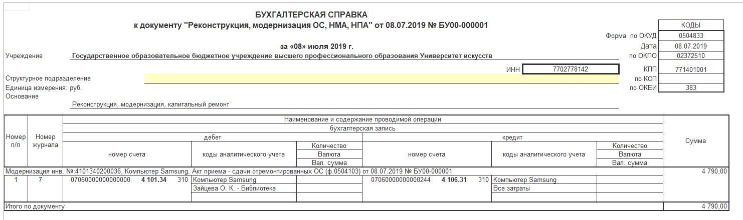 Достаточно часто в ходе эксплуатации основного средства в организации появляется необходимость это основное средство отремонтировать или же каким-то образом усовершенствовать, за счет вышеуказанных манипуляций может измениться полезный срок действия или же увеличиться производительность основного средства. Да счет таких действий увеличится и балансовая стоимость. Все изменений надо фиксировать в бухгалтерском учете организации. Ниже будет приведен пример отображения усовершенствования основного средства в программе 1С: Бухгалтерия государственного учреждения (ред. 2.0).