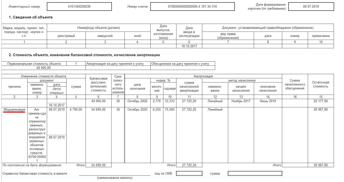 После выполнения всех вышеуказанных действия в инвентарной карточке будет отображена вся новая информация.