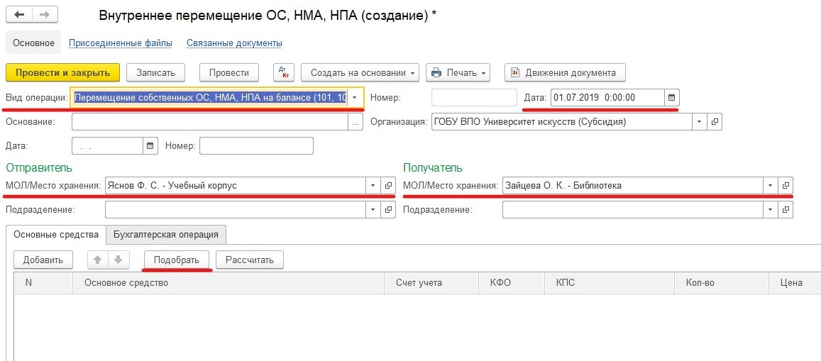 В шапке указывается операция "Перемещение ОС на балансе (101,102,103)". Ставится дата перемещения и устанавливается отправитель и получатель основного средства.