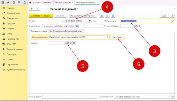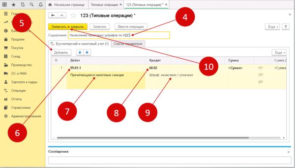 • в пункте «Содержание» указываются такие сведения, как наименование типовой операции (примером услуги становится «Начисление налоговых штрафов по НДС»);