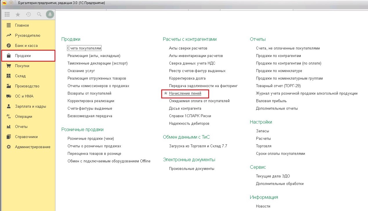 Будем работать с документом «Начисление пеней». Он находиться: «Продажи»- «Расчеты с контрагентами».